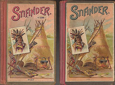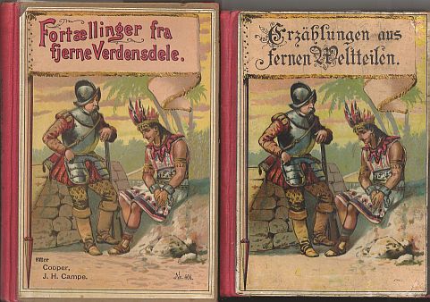 4. Löwensohn ”Erzählungen aus fernen Weltteilen”. ”Nach J.H.Campe, Cooper etc. für die Jugend bearbeitet von W. Christian. Mit sechs Illustrationen in Farbendruck.” U. år. 120 s. Illustration på forperm + 5 indklæbede illustrationer. Bogblokkens format: 19,0x13,7 cm. På sidste side nederst: ”Druck und Verlag von G. Löwensohn, Fürth (Baiern).” Bind: Karton med rød shirtingsryg. N. Hansen & Co. ”Fortællinger fra fjerne Verdensdele”. ”Efter J.H.Campe, Cooper etc. Bearbejdet for Ungdommen af W. Christian. Med seks illustrationer i Farvetryk. Kjøbenhavn. N. Hansen & Co.s Forlag.” U. år. 120 s. Illustration på forperm + 5 indklæbede illustrationer. Bogblokkens format: 20,1x14,0 cm. Bind: Karton med rød shirtingsryg. Alle illustrationer i dansk og tysk udgave er identiske.