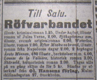 "Till Salu... Under hafvet, illustr roman af Jules Verne, 2.00" osv. Vid den här tidpunkten fanns kända versioner av "En världsomsegling under havet" bara från H Pettersson 1872, Lamms förlag 1879-80 och Beijers 1894, förutom utgåvan i På lediga stunder. Vad kan detta vara?