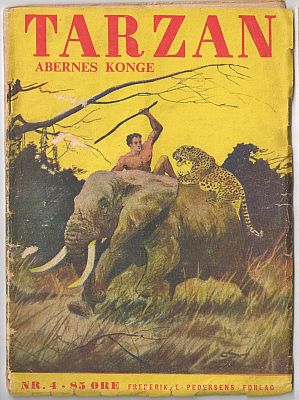 Endelig et par sjældne hefter. Frederik E. Pedersens Forlag påbegyndte genudsendelsen af Tarzanbøgerne i 1952. Det første bind "TARZAN abernes konge" udsendtes i 5 hefter med individuelle omslag, som tilsammen udgjorde den komplette bog - som vi kender det fra Chr. Erichsens Forlag og I ledige Timer. Det var åbenbart ikke en succes, for det er den eneste Tarzan-bog, der blev udsendt på denne måde. Omslagene er tegnede af Oscar Knudsen. ![]() Henrik