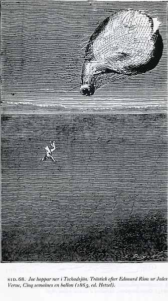 I slutet av boken finns illustrationer, däribland tre av Verne-illustratörer. Här ett trästick efter Riou till Cinq semaines en ballon, där Joe hoppar ner i Tschadsjön.