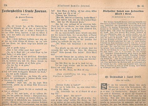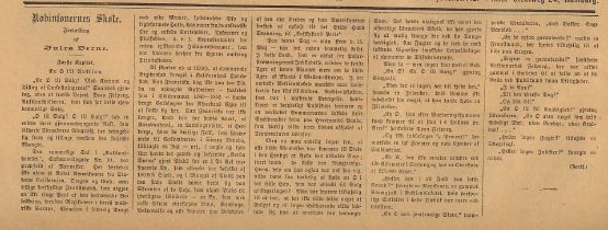 *) Begge i tillægget "Eventyrlige Reiser og Skildringer fra Nær og Fjern". Der er tale om andre oversættelser end dem i Schous "Mindre fortællinger" ![]() ![]() ***) Også kendt som Dr. Hjerteløs. Oversættelsen er forskellig fra den i "No. 9672" fra Andreas Schou. Læs kopi af novellen: pliskplask.html ![]() "Robur Erobreren" 1887 - slutningen bringes som føljeton i nr. 1 - nr. 13 (1. januar - 25. Marts 1888) ![]() ![]() ![]() "Robinsonernes Skole" bringes som føljeton i nr. 24 - nr. 51 (10. Juni - 16. december 1888). ![]() Følgende roman og korte historier har uden tvivl også været bragt i Illustreret Familie-Journal. De er fundet i den svenske udgave, men der er på denne tid meget tæt forbindelse mellem Familie Journalen i Danmark og Sverige.