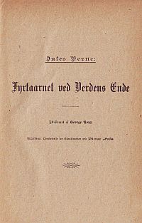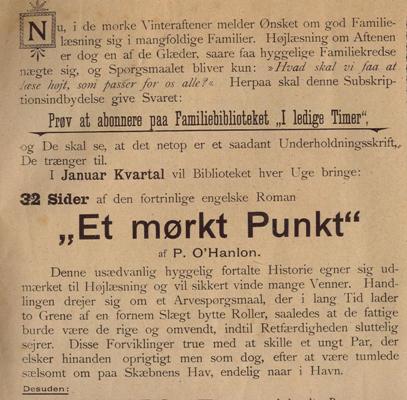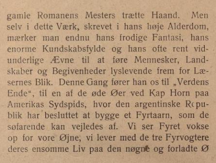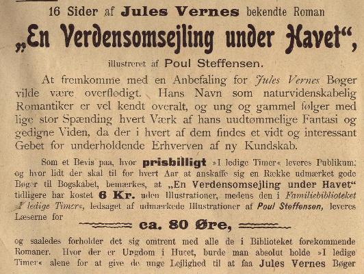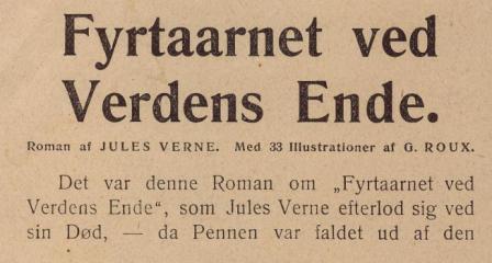 Reklame fra Illustreret Familie-Journals Jule-Nummer fra 1906 for Familiebiblioteket "I ledige Timer" for det kommende år med reklame for "Fyrtårnet ved Verden Ende" med en dramatisk beskrivelse af romanens tilblivelse. I virkeligheden var det Jules Vernes søn Michel Verne , der skrev romanen færdig på grundlag af et udkast til de første 11 kapitler, som Verne havde skrevet i 1901.