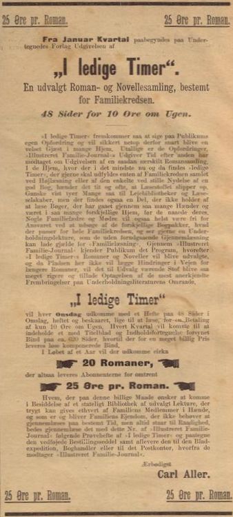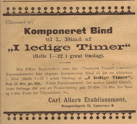 | Jules Verne udgivet i Danmark af Carl Allers Etablissement: A. Føljetonner i Illustreret Familie Journal B. Jules Verneromaner i I ledige Timer C. I ledige Timer som hefter D. Samlebind for I ledige Timer E. Reklamer for I ledige Timer F. Omtale af Jules Vernes død Se desuden vores tillæg med oversigt over samtlige 73 bind af I ledige Timer, samt Illustreret Familie Journals Bibliotek og omtale af Børnenes Bog 1884 - 1910: A. Føljetonner i Illustreret Familie Journal 1886 - 1890: