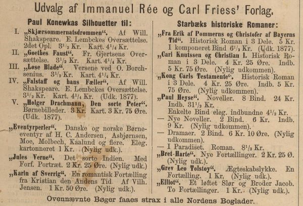 | B. reklame for Det sorte Indien. I "Nær og Fjern" fra 15/12 1878 reklameres for "Det sorte Indien" fra Immanuel Rée og Carl Friess´ Forlag. Den betegnes som "Nylig udk.". På titelbladet står 1879 - så det er da en ny oplysning, at bogen i virkeligheden er udkommet i slutningen af 1878! ![]() |