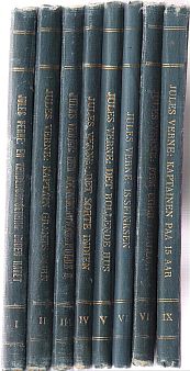 nu næsten udelukkende i privatindbinding. Nedenfor er vist otte af de ni bind, desværre er Jorden rundt i 80 Dage endnu ikke fundet.