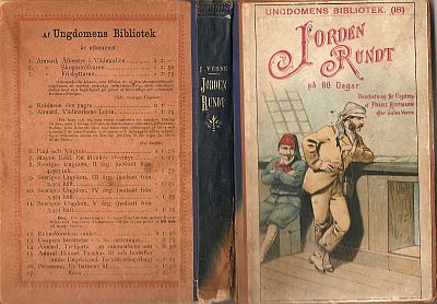 | Tre udenlandske udgaver med samme forsideillustration. Svensk udgave fra Adolf Johnsons förlag 1890: Jorden rundt på 80 dagar. Bearbetning för ungdom af Franz Hoffmann efter Jules Verne. Ungdomens Bibliotek nr 18. Översättning af J. Granlund (från tyskan). 228 sidor. 4 osignerade, opaginerade planscher. Blå klotrygg med kartongpärmar med påklistrad pärmbild i färg.