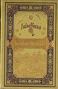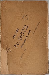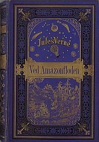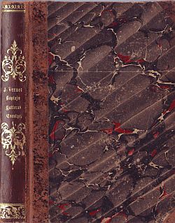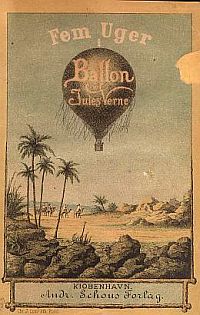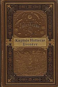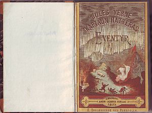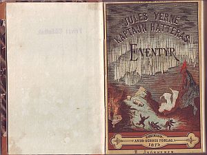 Fra Henriks samling: heftet eksemplar af "5 Uger i Ballon", 2. Oplag 1883 Eksemplaret har fået en noget hård medfart i sit snart 125-årige liv. Forlagsnavnet er med - og man kan se, at "bambusrammen" er tilstede forneden, men den udtyndes til en streg rundt om billedet. Bagsiden er identisk med den, vi kender fra "Mindre Fortællinger". ![]() Fra Allan Jørgensens samling: Privatindbinding af Kaptajn Hatteras i 2 bind, der har bevaret de to forsidetegninger.