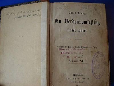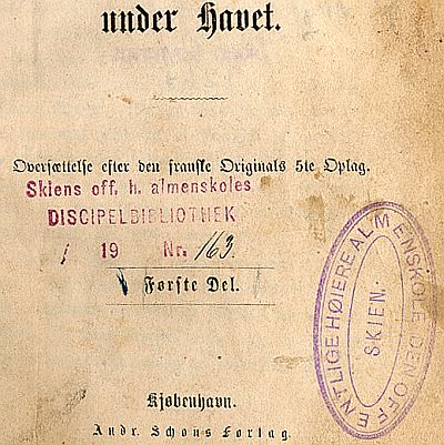 vist i artikel i Illustreret Tidende, hvis jeg husker rigtigt (Henrik). Link til Verniana (et glimrende "tidsskrift" med artikler om Vernes liv og værker) : http://jv.gilead.org.il/studies/index.en.html Czarens Kureer [Michel Strogoff]. Kjobenhavn : A. Schous 1877, cartonné [BMA <1455126> Maison de Jules Verne] Fem Uger i Ballon [Cinq Semaines en ballon]. Kjobenhavn : A. Schous 1872, cartonné [BMA <1456081> Maison de Jules Verne] Kaptajn Grants Born [Les Enfants du capitaine Grant]. Kjobenhavn : A Schous 1879, cartonné [BMA <1456089> Maison de Jules Verne] Kaptajnen paa temten Aar [Un Capitaine de quinze ans]. Kjobenhavn : A. Schous 1880, cartonné [BMA <1456024> Maison de Jules Verne] Paa Opmaaling i Sydafrika [Aventures de trois Russes et de trois Anglais dans l’Afrique australe]. Kjobenhavn : A. Schous 1878, cartonné [BMA <1456025> Maison de Jules Verne] Rejsen til Maanen [De la Terre à la Lune]. Kjobenhavn : A. Schous 1876, cartonné [BMA <1456080> Maison de Jules Verne] Rundt om Jorden i 80 Dage [Le Tour du monde en quatre-vingts jours]. Kjobenhavn : A. Schous, 3e éd. 1877, cartonné [BMA <1450084> Maison de Jules Verne] En Verdensomsejling under Havet [Vingt mille lieues sous les mers], vol. 1. Kjobenhavn : A. Schous 1872, cartonné [BMA <1456079> Maison de Jules Verne] Danmark - Norge. Frem til omkring 1920 er der fri ombyttelighed mellem norske og danske forlag. Således udsendes de to berømte Verneromaner Den hemmelighedsfulde Ø (Cammermeyer 1876) og Rejsen til Jordens indre (Steensballe 1873) ikke på Schous Forlag, fordi de udgives i Norge. Omvendt findes der fra før 1920 ikke særlig mange Verneudgivelser på norsk, fordi bl.a. Schous udgaver har været handlet i Norge. Fra Per Johans samling: Et eksemplar af den første Schou-roman fra et norsk bibliotek.