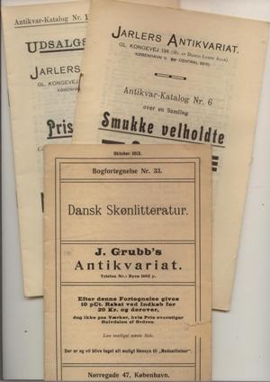 2 fra Jarlers antikvariat og 1 fra Grubb´s. I alle 3 var Jules Verne bøger til salg. Hos Jarler var det dels Bojesen/Gyldendal i 3-bindsudgaven i komp. bind til 10 kr. - senere nedsat til 7,75 (!!), dels Jespersen udgaver til 1,50 kr. stk. eller 6 titler i et bind til 3,25 kr. og endelig Jordens Opdagelseshistorie bind I-II til 1,50 kr. stk. indbundet. (Et røverkøb !) Hos Grubb er der 8 Schou udgaver - de fleste i