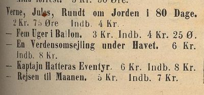 Titlerne er: Czarens Kureer, Fem Uger i Ballon (1884), Kaptajn Grants Børn, Keraban Stivnakke, Nord mod Syd, Paa Opmaaling i Sydafrika, Rundt om Jorden i 80 Dage (1884) og Sydstjernen. Ved de fleste - men ikke alle - skrives, at de er udsolgt i boghandlen. Undtagelserne er "Nord mod Syd" og "Rundt om Jorden" - de er altså stadig i boghandlen 25-29 år efter udgivelsen, hvis man skal tro Grubb!! |