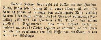 | En rejseskildring i Vernes fodspor fra Andr. Schous Forlag: Nellie Bly: ”Min Rejse omkring Jorden i 72 Dage”. Oversat af N. Boas, Andr. Schous Forlag, Kjøbenhavn 1890..