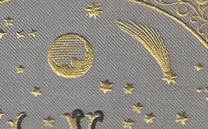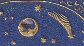 havde behov for det, eller muligvis efter bestilling af en speciel farve. ![]() Om bogbinderne og forsatspapiret: Nogle af de første romaner er med "Beuchel-bind" med brunt forsatspapir samt et lille, fint bogbindermærke Bogbindermærke fra Rejsen til Maanen 1876: