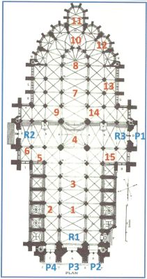 henviser til grundplanen. Kommentarer i parenteser er mine. Som i Ragz har kirken i Amiens tværskib og