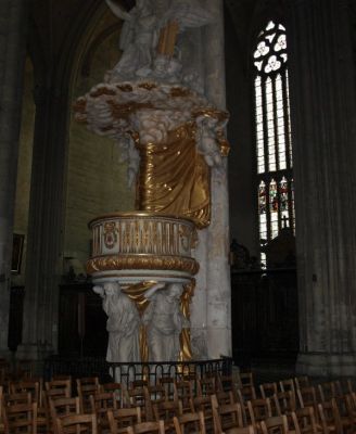katedralen i Amiens. ”Et bundt af lysstråler, der passerede gennem en af åbningerne i apsis, faldt direkte på prædikestolen, der var ophængt på en af kirkeskibets søjler, og det syntes som om det gav liv til kæmpen, der understøttede den på sine enorme skuldre (s. 229)." . ![]() . Prædikestolen og ”kæmpen, der understøttede den på sine skuldre”. Der er dog i alt tre store statuer under prædikestolen i den noget mørke kirke.