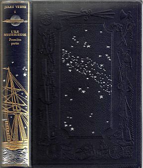 ryggen: "JULES VERNE 1 L´ILE MYSTERIEUSE Première partie". Den er udformet som en bog i sort komponeret læderbind med tryk i