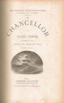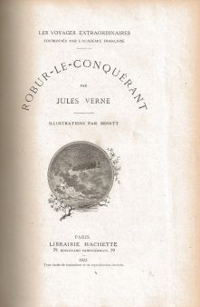 Illustrationer af G. Roux. 491 s. + 1 s. indholdsfortegnelse. Tryk: Imprimerie Gauthier-Villars et Cie, 55, quai des Grands-Augustins, Paris. (Nr. 52747). Dobbeltbind = "Serie B". Indbundet i grøn halvlæder med originale for- og bagomslag medindbundet. (Ryggen har åbenbart ikke været værd at medindbinde) ![]() Iflg. Gondolo della Riva er dette 1. udgaven af denne sidste af Jules Vernes romaner, udgivet samtidig med det lille format. |