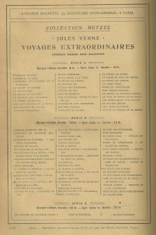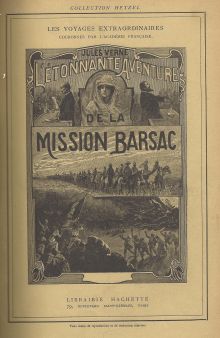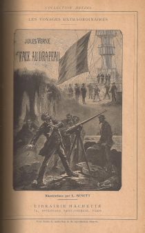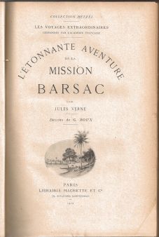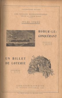 interessant eksemplar. VE14 "Le Chancellor" med "Martin Paz". Librairie Hachette, 79, Boulevard Saint-Germain, 79, Paris. (ca. 1928). Illustreret af Riou og Férat. 220 s. Tryk: Imp. de Vaugirard, Paris. 1928. Omslagstryk: Imp. de Matteis, Paris. Heftet enkeltbind(=Serie A) indbundet i grøn halvlæder - sammen med VE44. ... ![]() ... VE44 "Face au Drapeau" Librairie Hachette, 79, Boulevard Saint-Germain, 79, Paris. (ca. 1928). Illustreret af L. Benett. 220 s. + 1 s. indholdsfortegnelse. Tryk: Imprimerie de Vaugirard, H.-L. Mott, Directeur, Impasse Ronsin, Paris. Omslagstryk: Imp. de Matteis, Paris. Heftet enkeltbind(=Serie A) indbundet i grøn halvlæder sammen med VE14. ... ![]() Som det fremgår af bagsidereklamen kostede Serie A 10 Fr. pr. bind, men på ryggene af begge eksemplarer er der overtrykt med ny pris: 15 Fr. Dette kan meget vel passe med dateringen 1928-29, hvor inflationen tog fart efter børskrakket i New York, som spredte sig til hele verden. Det er interessant at se hvordan de heftede eksemplarer fra både Hetzel og Hachette ser ud. VE 28 "Robur-le-Conquérant" og VE 29 "Un Billet de Loterie - Le Numéro 9672" med "Fritt-Flacc". Librairie Hachette, 79, Boulevard Saint-Germain, 79, Paris. 1922. 218 s. + 1 s. indholdsfortegnelse og 188 s. Illustrationer af L. Benett og af G. Roux. Tryk: Imp. Vaugirard, H.-L. Mott, Directeur, 12-13, Impasse Ronsin, Paris. Omslagstryk: Imp. de Matteis, Paris.Dobbeltbind = Serie B. Bind: Grøn halvlæderindbinding med originale for- og bagomslag medindbundet. ![]() ![]() VE65 "L´Étonnante Aventure de la Mission Barsac" del 1-2. Librairie