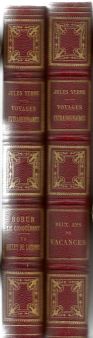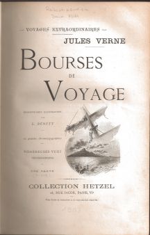 permer. Designet af A. Lenegre. VE 28 + VE 29: Jules Verne: Robur le Conquérant - Un billet de loterie, Hetzel et Cie, Paris 1886, 221 sider + 199 sider, Illustreret af Benett og Roux, katalog DF medindbundet. Guldsnit på tre sider. VE 32: Jules Verne: Deux ans de Vacances, Hetzel og Cie, Paris udateret, men med katalog EL, der er fra 1888, 474 sider, illustreret af Benett og et farvelagt kort. Guldsnit på tre sider. . ![]() . Begge bøger har bogbinderens navn, A. Lenègre, nederst på forpermens højre hjørne. . ![]() VE 51: ”Bourses de Voyage”. .