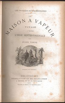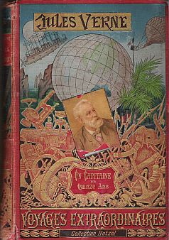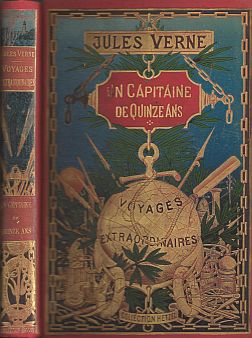 af typen "Aux deux Elephants". VE 20 "La Maison a Vapeur". J. Hetzel et Cie, 18 Rue Jacob, Paris. U. år. . ![]() . Indbindingen er rød komponeret helshirting med tryk i sort og guld af typen "Aux deus Élephants". (Beskrevet i Jauzac s. 226) . Aux Portrait collé og Aux Portrait imprimé ![]() VE 17 "Un Capitaine de Quinze Ans. J. Hetzel et Cie, 18, Rue Jacob, Paris. Illustrationer af H. Meyer. 376 s.