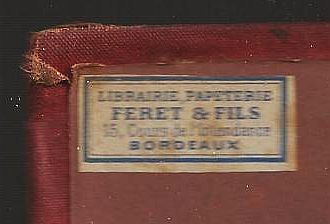 ![]() Boghandlermrk. "Librairie Papeterie Feret et Fils, 15, Cours de