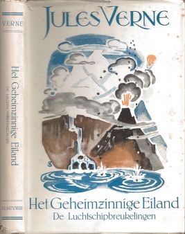 "Het Geheimzinnige Eiland De Luchtschipbreukelingen", Serien "Wonderreizen", 7. oplag Elsevier 1931. Med originale franske illustrationer. 223 s. + 3 s. indh. Book- en Kunstdrukkerij P. A. Geurts, Nijmegen. Gråblå komponeret helshirting med tryk i sort og guld - med originalt smudsomslag.