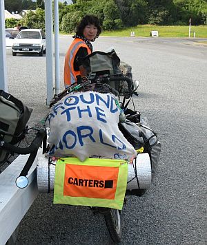 Fra "Le Monde", 28. sep. 2009: En franskmand Guillaume Prébois har cyklet jorden rundt på 80 dage. Kortet fra avisen viser, at han har taget en lidt alternativ rute over Australien, men så kommer Kaptajn Grants Børn jo næsten også med. ![]() ![]() Denne unge japanske cyklist traf Lejf på en rasteplads i New Zealand. Han har lang vej endnu, har afsat 2 år og ikke kun 80 dage til projektet. Han håber på et tidspunkt også at nå til Danmark. ![]() Jorden rundt alene: ![]() Beretningen om Joshua Slogum,
