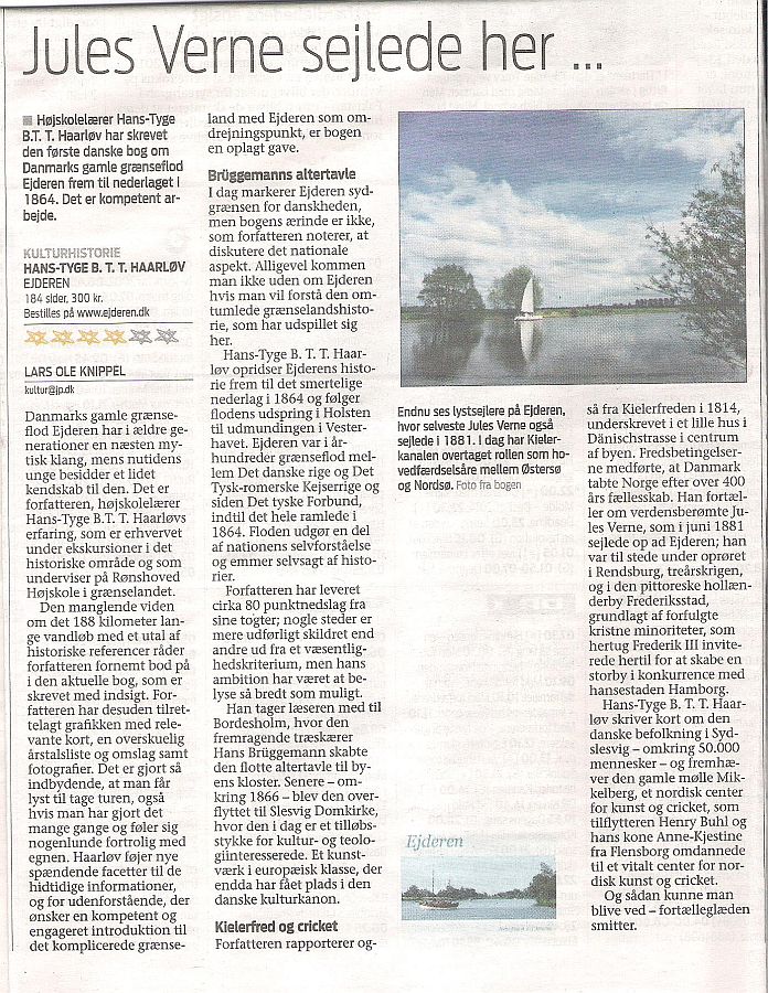 Jyllandsposten 3. jan 2015: med overskriften "Jules Verne sejlede her". Det er bogen Ejderen, skrevet af Hans-Tyge B.T.T. Haarløv. Et af bogens indslag er Vernes rejse i 1881. Bogen købes på ejderen.dk for 300 kr. plus porto. Bogen er på 184 sider. Mon ikke denne er er hjemmetrykt! ![]() ![]()