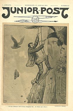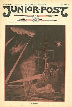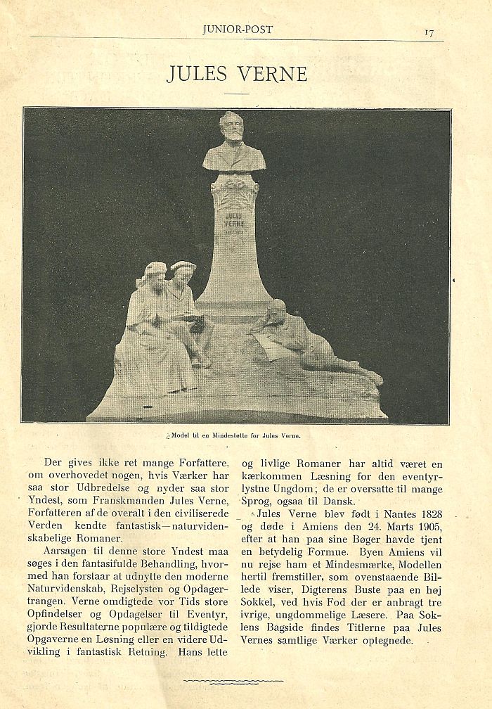 hendes konklusioner (og dem er der en del af) er f.eks.: ![]() Så ved I da det ! , hvis ellers legedrengene forstår hvad hun mener. Børnebladet "Junior-Post" fra 1909: ![]() # 2 fra 17 januar 1909. Selv om forsiden kunne lede tanken hen på Jules Verne, så har det dog ikke noget med ham at gøre. ![]() Børnebladet # 28 fra 14 juli 1909. Og det er side 220 i den indbundne årgang 1909. Desværre er det ikke i øjeblikket muligt at levere bedre scan da jeg ikke har lyst til at voldtage mit indbundne eksemplar for meget. Men der er ikke andet om Verne i årgangen end dette side-indslag "Det Hele - for hele familien" Nr.1, Januar 1956, 4.