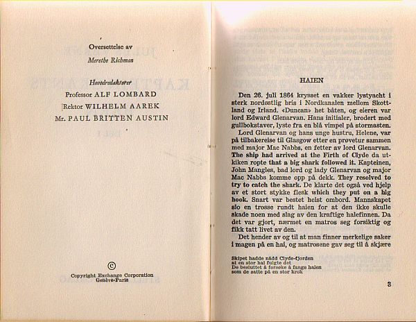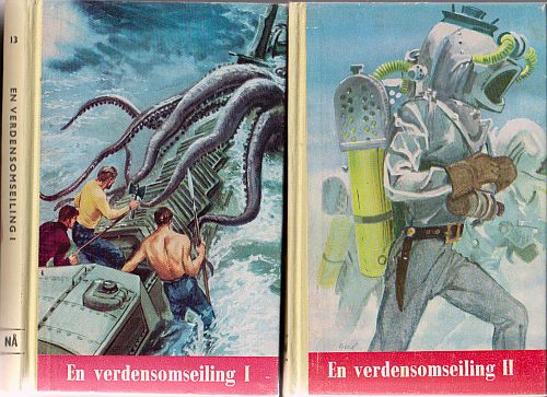 Stella bokforlag - blå shirting (uå): "En Verdensomseiling under havet I-II" Stella bokforlag - blå shirting (uå): "Kaptein Grants barn I-II" Stella bokforlag m/ forsidebilde (uå): "En Verdensomseiling under havet I-II" Alle 6 oversatt av Merethe Richman (utgavene tilsynelatende helt tilsvarende det svenske Niloe - med div. engelske fraser)