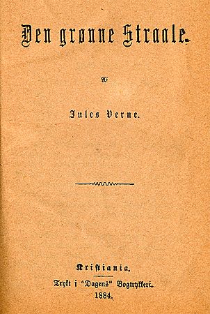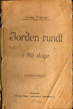 "Avisens føljeton: Jorden rundt i 80 dage , Kristiania, Nikolai Olsens bogtrykkeri, Grændsen 2 Bak: Annonser for Olaf Norlis forlag Universitetsgd. 24, Kristiania, så - muligens fra Olaf Norlis forlag Eksemplaret er for hånd påskrevet året 1897 , så dette er kanskje utgivelsesåret? (Nils og Per Johan) ![]() Det