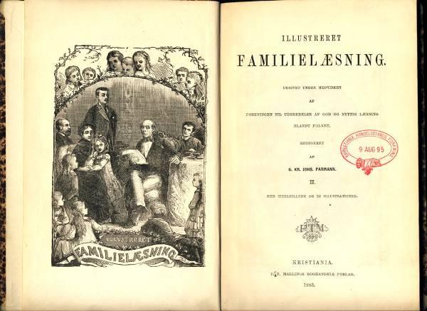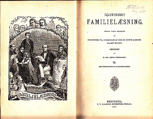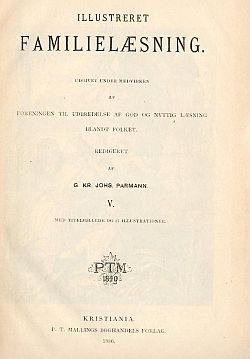 Bind VI 1887: ILLUSTRERET FAMILELÆSNING. Udgiven under medvirken af Foreningen til Udbredelse af god og nyttig Læsning blandt Folket. Redigeret af G. Kr. Johs. Parmann. Bind VI. Oslo 1887. 8vo. 181 + (3) p. Med tittelbilledeog 30 illustrationer. Av innholdet: 'Oppdagelsesreiser i Afrika' av Jules Verne.. -Noen anmeldelser innbundet bak, tok jeg også med,