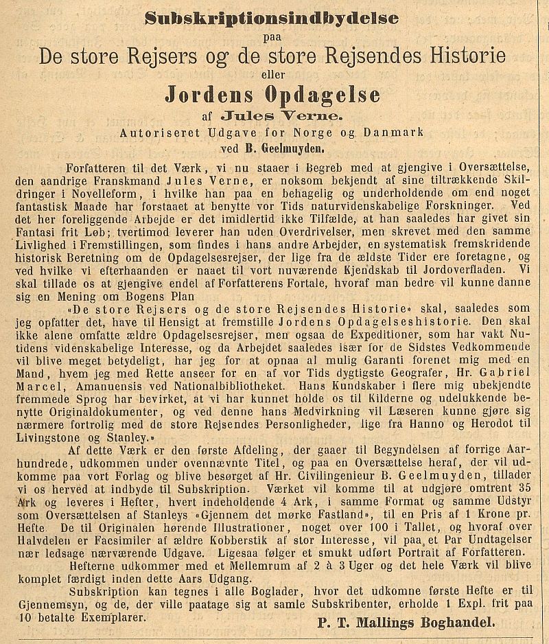 En subskriptionsindbydelse til: "Jordens Opdagelse" fra P. T. Mallings