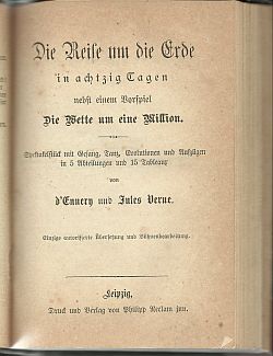 Meget hurtigt dukker der både teaterstykker og revyer op i Danmark, der bruger løs af JVs navn og popularitet. Billederne viser en meget ung Jules Verne på vej frem samt en nylig udgivet samling af Vernes hidtil ikke udgivne stykker. |