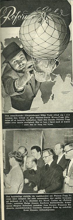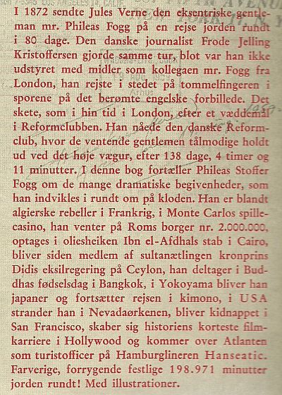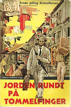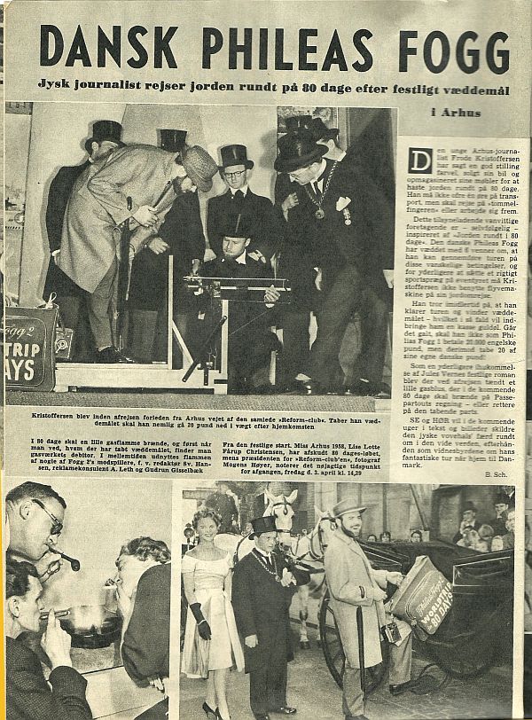 Frode Kristoffersen. "Dansk Phileas Fogg"!. Se og hør nr. 15, 1. april 1959 bringer en omtale af et væddemål en ung journalist har indgået. Der er tale om ingen ringere end den senere så kendte TV-mand Frode Kristoffersen, der blev Europaparlamentsmedlem for de konservative. Det fremgår i øvrigt af lidt søgning på nettet, at han led et forsmædeligt nederlag. Turen tog ham 138 dage, fire timer og 11 minutter, men der var nu osse vanskelige betingelser i væddemålet. ![]() Efter hjemkomsten skrev Frode en bog::