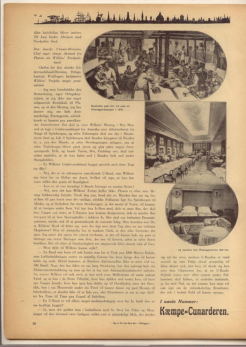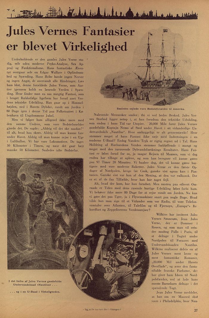 Heri er en artikel "Jules Vernes Fantasier er blevet Virkelighed". Ikke overraskende nævnes i hvor høj grad Jules Vernes forudsigelser er blevet til virkelighed. Dette som optakt til en beskrivelse af en planlagt ekspedition med en U-båd under den arktiske iskappe. Ekspeditionen planlægges af en "Wilkins", som har lejet en udrangeret amerikansk U-båd, som skal ombygges til formålet. Rejsen skal angiveligt foregå i juni-juli 1931. Wilkins har inviteret Jean Jules Verne til at deltage; men han har takket