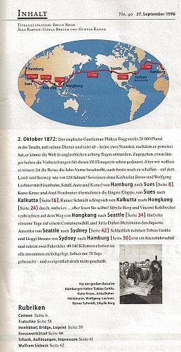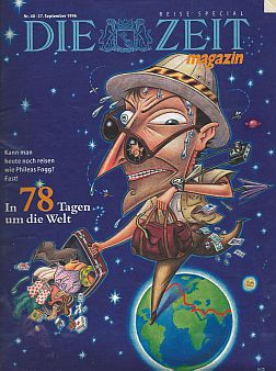 78 dage jorden rundt. Et nr. af tidsskriftet "Die Zeit Magazin" - et specielt rejsenummer fra 27. september 1996. Heri artikler om en gentagelse af Phileas Fogg´s rejse omkring Jorden. Man har sendt forskellige personer ud på hver etape af rejsen, og disse beskriver så deres oplevelser i hver deres artikel. Rejseruten er ikke helt identisk med Phileas Foggs; men ganske interessant. Tilsammen tog det dem 78 dage at gennemføre turen, så det har ikke været ment som en konkurrence.. ![]()
