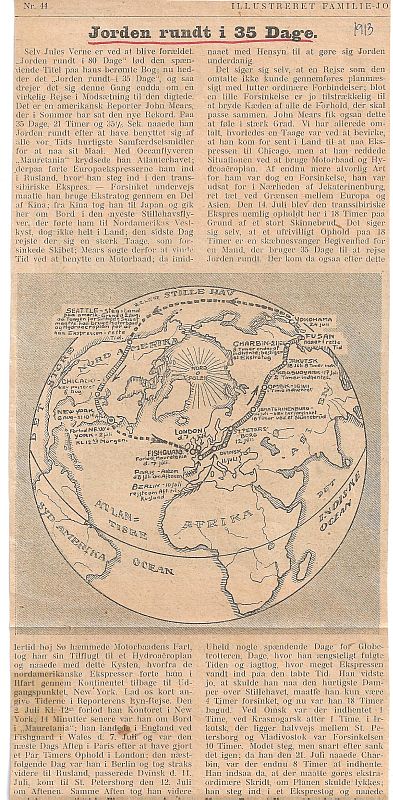 "Illustreret Familie Journal" markeret med 1913 og omhandler en jordomrejse i Phileas Foggs fodspor; men denne rejse varede kun 35 dage. Åbenbart én blandt mange, der har forsøgt sig - som Nellie Bly og Palle Huld. . ![]() |