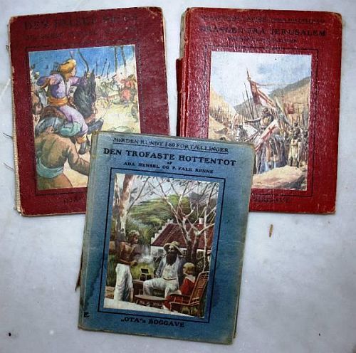 De 8 bøger blev betegnet A til H. Her er vist forsider til 6 af dem, samt en typisk bagside fra serien. A: Paa Sæteren B: Piet og Nero C: Sovedråberne E: Den trofaste Hottentot G: Sefis' Løfte H: Smørtyven ![]() ![]() OTAs samlealbum