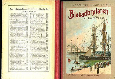 3. Blokadbrytaren. 1903: Blokadbrytaren. Johan Jönssons Boktryckeriaktiebolag, Norrköping. Övers. N. Nisbeth. Åtta illustrationer av T. Ödberg. 98 sidor. Ungdomens Bibliotek No.76. Originalkartonnerad med röd klotrygg. Omslagsillustration av G L Fürth. Pris 1:75. Version 1: Prisuppgift på främre omslaget, förteckning över seriens böcker t o m nr 79 på bakre omslaget, samt förteckning över sällskapsspel. Ryggtext i guldtryck. Version 2: Saknar prisuppgift på främre omslaget, förteckning på bakre omslaget över seriens böcker t o m nr 130. Ryggtitel saknas. Denne version må stamme fra ca. 1905, men der er tale om samme udgave, blot med forskellig reklame påklistret bagsiden.