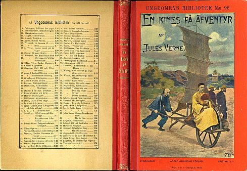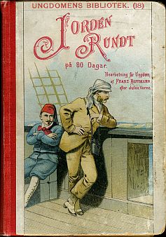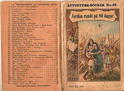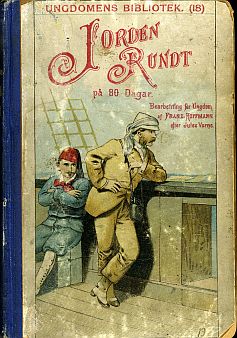 1898: Jorden rundt på 80 dagar. Fritt efter Jules Verne af Richard Krone. Äfventyrsböcker nr 38. Adolf Johnsons förlag. Johan Jönssons Boktryckeriaktiebolag (f d M W Wallberg & Comp. Boktryckeri), Norrköping 1890. Anonym översättning. 72 sidor. Häftad med omslagsbild i färg. Pris 50 öre. ![]() Det är alltså frågan om två olika översättningar, bägge från tyskan, och den senare, från 1898, starkt förkortad. Omslaget på 1890-utgåvan är detsamma som den danska utgåvan från samma tid från N Hansen & Co’s forlag, och precis som denna innehåller den svenska en tillagd berättelse om hur det gick för Phileas Fogg senare i livet – lyckligt, förstås. Det är intressant med