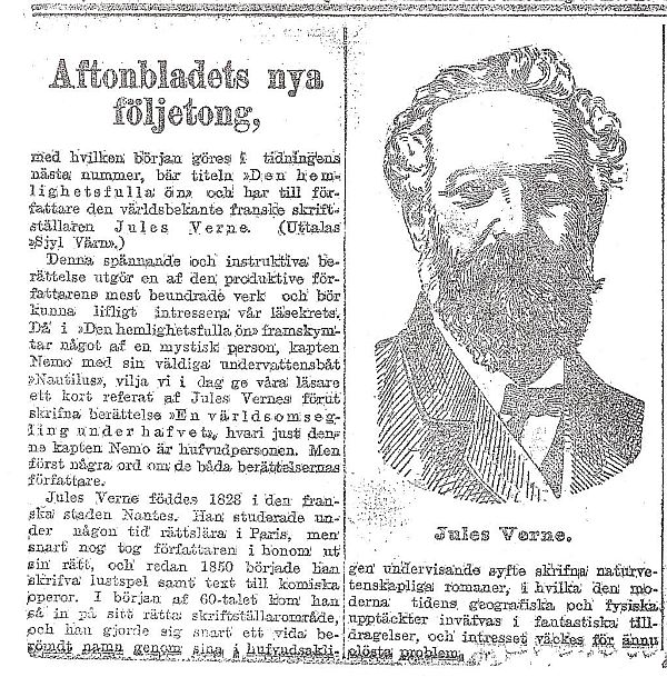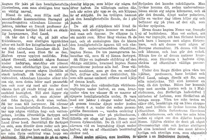 Den 30 januari 1907 införde man en liten artikel om Jules Verne och om den kommande följetongen med en sammanfattning av ”En världsomsegling under hafvet”, vilket man tydligen tyckte att läsarna behövde. I nästa nummer, den 2 februari, började följetongen, som sen fortsatte ända till den 15 augusti 1908. Varje dag trycktes 6-7 spalter nederst på sidan, med annan text på baksidan. Så förhoppningen att finna den i urklippt skick är nog liten!