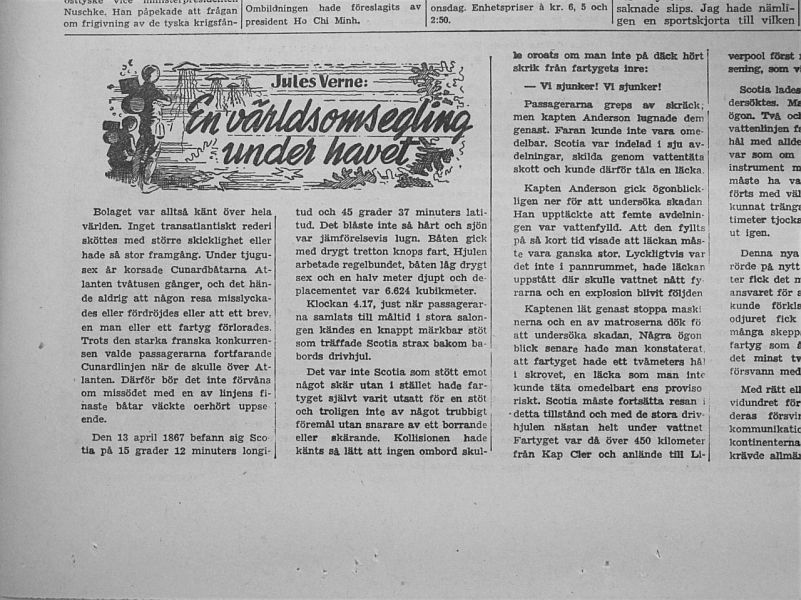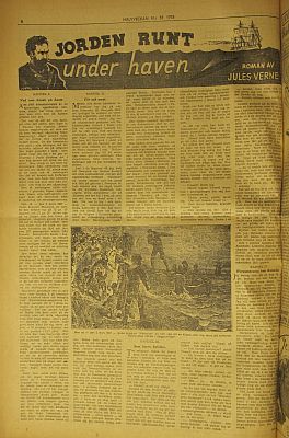 | Den efterfølgende oversigt må antages at være meget mangelfuld. Supplerende oplysninger modtages med glæde. Aftonbladet. 30.01.1907 - 15.08.1908 . Aftonbladets Half-veckoupplaga införde ”Den hemlighetsfulla ön 1907-1908. Så det är mera av en veckotidning, som gavs ut två gånger i veckan, men formatet är dagstidning och pappret också dagstidning. Se indledende artikel om JV samt uddrag af to afsnit: Aftonbladet Tidigare har jag berättat om fyndet av "Den hemlighetsfulla ön" som följetong i Aftonbladets Halfvecko-upplaga, där den trycktes den 30 januari 1907 till den 15 augusti 1908, med enkla illustrationer insprängda i texten. Aftonbladet-"koncernen" ägde även tidningen Dagen mellan åren 1896 och 1913. En del material användes i båda tidningarna, och så skedde även med Verne-följetongen. Eftersom Dagen utkom varje dag, så gick det fortare att ge ut hela följetongen: den trycktes från den 13 februari 1907 till och med den 18 juli samma år. Samma illustrationer, och "ensidig" utan sidnumrering, precis som i Halfvecko-upplagan. ... ![]() Ännu ett fynd av "Framtidens snälltåg"! Denna gång i Östgöta-Correspondenten den 22 april 1905. Inte samma översättning som i Svenska Tribunen. ![]() . En följetong. ”En världsomsegling under havet” trycktes i Arbetar-Tidningen 1955. Tidningen trycktes av Västan AB i Göteborg. Följetongen startade den 20 september och var inte avslutad vid årsskiftet – slutdatum ej känt. Den 31 december kom det 87:e avsnittet. .