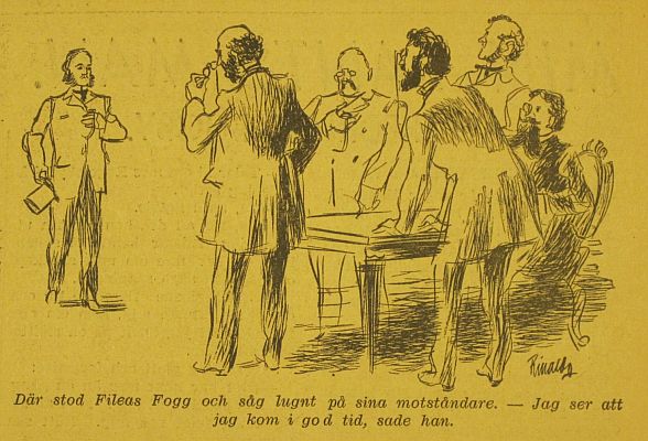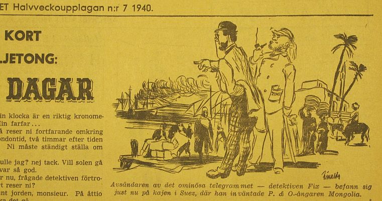 Jorden runt på 80 dagar. Aftonbladets Halvvecko-upplaga den 20 januari - 21 februari 1940. Löpande text, ungefär en helsida per nummer. Illustrerad av signaturen Rinaldo. Översättare okänd.