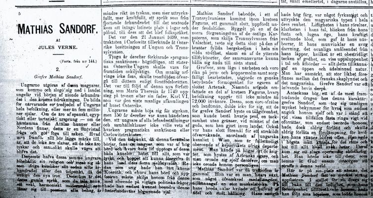Mathias Sandorf trycktes som spaltföljetong i dagstidningen Figaro från den 22 juni till den 16 oktober 1885 i 163 avsnitt. Översättare okänd, men det är inte samma översättning som när boken gavs ut av Lamms förlag - 1888! Så Figaro var först! . ![]() |