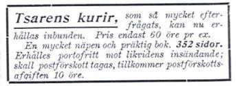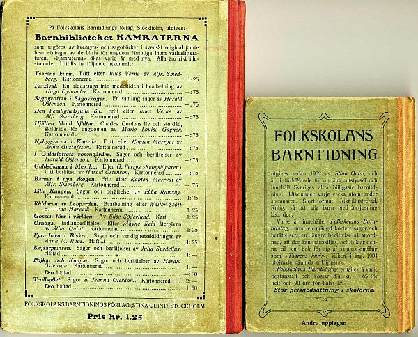 Tzaren 1904 Det som inte uppmärksammats är att dessa bägge berättelser ursprungligen utgavs som urklippsföljetonger i tidskriften Folkskolans barntidning! Tsarens kurir gavs ut under större delen av året med (vanligtvis) två blad i vartannat nummer som en vanlig urklippsföljetong: varje blad bestod av åtta sidor, som veks ihop till ett ark. I nummer 33, i slutet av året, anmäles så att det finns pärmar till följetongen att köpa. En pärm kostade 25 öre, inklusive postporto. Ingenting anges om pärmens utseende, men det ex jag har består av en röd, blindpressad klotpärm med ryggtext i guld i format ca 9x13 cm. I nummer 30 från november 1905 meddelas sedan att Tsarens kurir, ”som så mycket efterfrågats”, nu finns att köpa i bokform, inbunden till priset 60 öre. Jag har inte sett detta band, men jag tror att det var samma halvklotband med påklistrad pärmbild, som finns till 1907 års upplaga, vilken torde vara identisk med 1905-utgåvan, sånär som på tryckåret och uppgift om andra upplagan på bakre pärmen (1907 är priset dock 75 öre).