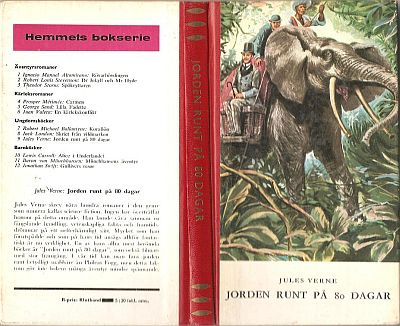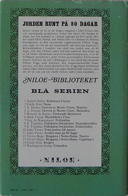 2. Jorden runt på 80 dagar. Förlag Niloé, Stockholm. Ingår i serien Hemmets bokserie. 1968 (122 s). 3. Jorden runt på 80 dagar. Översatt och bearbetad av Gustav Jansson. Förlag International Book Automation (IBA),, Uddevalla. 1: 1969 (i serien Hemmets bokserie), 2: 1975 (Ingår nu i serien Regnbågsböckerna. ). Nedenfor vist 1969: Att notera är att boken har ett övertryckt pris på bakre omslaget: 5:30 istället för det ursprungliga priset (5 kronor?). Boken finns alltså i två varianter (Jean + Lars-E) ![]() 4. Jorden runt på 80 dagar. Översatt av Jakob Gunnarsson. Med 51 helsidesillustrationer av De Neuville och L. Benett samt karta över Phileas Foggs resa. 24 cm. Förlag Niloé, Uddevalla. 1: 1986 (316 s), 1988 (Niloe-Biblioteket, Blå Serie denne udgave overgår så til Klassikerförlaget (Rabén & Sjögren).