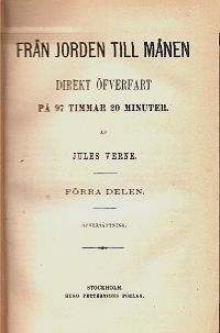 | Jules Verne-udgaver fra Hugo Petterssons förlag: 1. En världsomsegling under hafvet. 2 volymer; 237 + 286 s. 2:a upplagan (enl. KB). Petterssons (förlag). Tryckt i Stockholm. 1872. 2. Huset Playfair & C:o eller En bomullslast och ett hjärta. Hugo Petterssons förlag. Bergström & Lindroth, Stockholm. Anonym översättning (ej samma som Hjalmar Ewerlöfs förlag) Häftad, pris 60 öre. 1873 (73 + 6 sider). ![]() 3. Fem veckor i ballong eller en upptäcktresa i Afrika af tre engelsmän. Öpversättning af Robert Eachmann. Hugo Pettersons Förlag, Stockholm. 1873: ![]() 4. Från Jorden till månen. Direkt överfart på 97 timmar 20 minuter. Förra-sednare delen. Hugo Petterssons förlag. Bergström & Lindroth, Stockholm 1873. 189 + 189, 2 sidor.