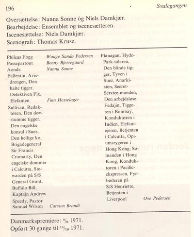I hovedrollerne: Phileas Fogg: Waage Sandø PedersenPassepartout: Benny Bjerregaard Aouda: Nanna Sonne. Svend Kragh-Jacobsen: "Teaterårbogen 1971-72", Gjellerup 1973.: