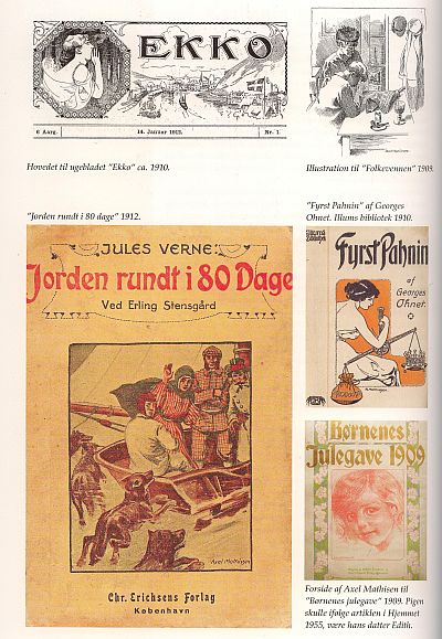 Et eksempel på de utallige omslag han leverer, her til Hasselbalchs tidlige Tarzanserie. Jan Jørgensen mener også at AM tegner forsiden til Jespersens VUH fra 1935, Bog om Axel Mathiesen. af Hanne Bistrup & Jan Toxværd Jørgensen. 320 sider, 299 kr. Forlaget Attika 2009. Hanne Bistrup er barnebarn af AM. ![]() Der er afbildning af "Jorden rundt i 80 Dage" fra Chr. Erichsen og billeder fra Branners serie. De sidste er forfatterne ikke særlig begejstrede for. Bogen er gennemillustreret med alle typer af illustrationer fra A.M.s lange virke, som gennemgås skiftevis tematisk og kronologisk. En meget flot bog til en rimelig pris. ![]() ![]() ![]() |