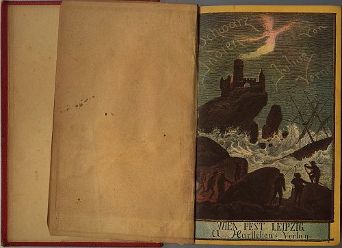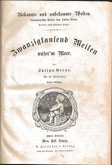 udtyndes til en linje i den øverste del. De store Hartleben. "Zwanzigtausend Meilen unter dem Meer" del 1-2 . A. Hartleben´s Verlag, Wien. Pest. Leipzig. U. år. (ca. 1877) Serien "Bekannte und unbekannte Welten" bd. 4-5. 3. oplag. 460 s. + 2 s. indholdsfort. Priv. halvfablea.. ![]() "Fünf Wochen im Ballon" 1876. Serien "Bekannte und ubekannte Welten. Abenteurliche Reisen von Jules